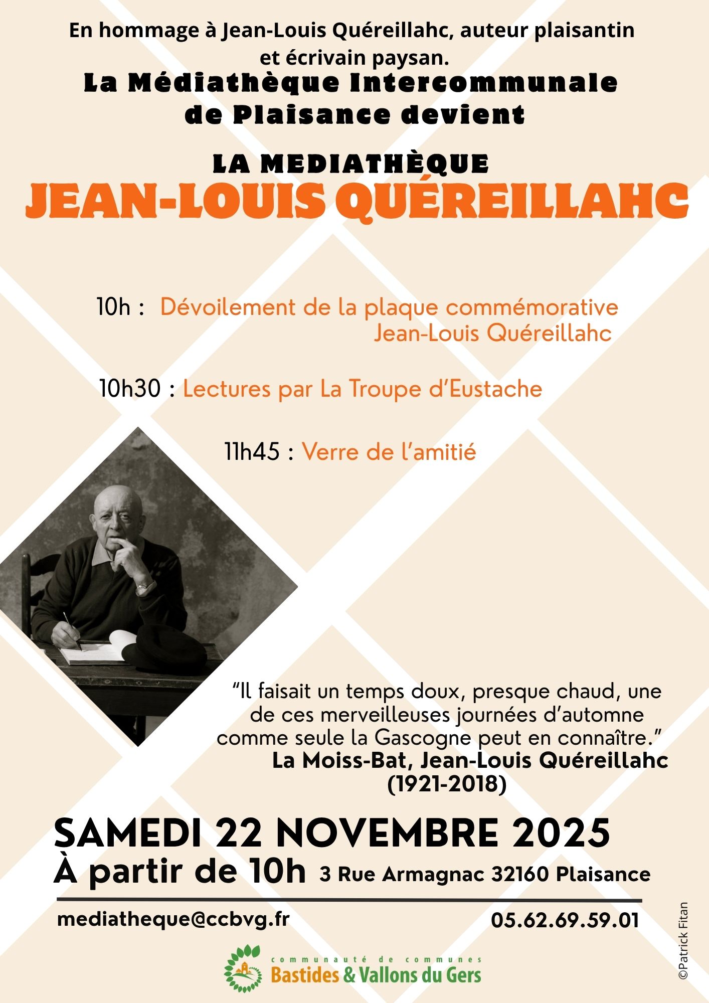 17 novembre 2025 by CCBVG La médiathèque intercommunale de Plaisance devient la médiathèque Jea-Louis Quéreillahc le 22 novembre…